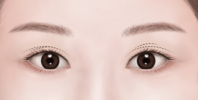 높게 고정된 쌍꺼풀을 속눈썹이 들리지 않을 정도의 쌍꺼풀 라인으로 낮추어 해결합니다.