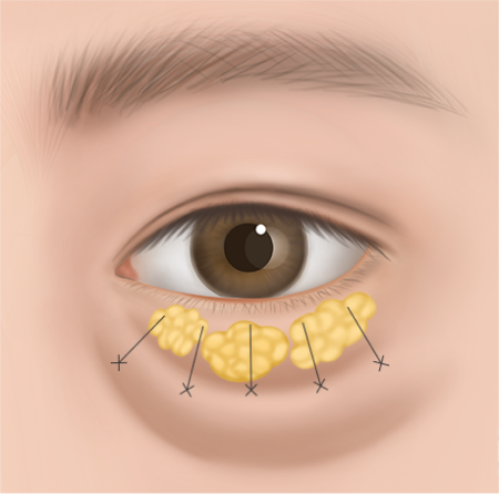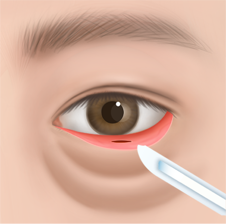 눈밑의 처짐 정도, 지방량에 따라 눈 안쪽 결막 또는 아랫속눈썹라인 절개