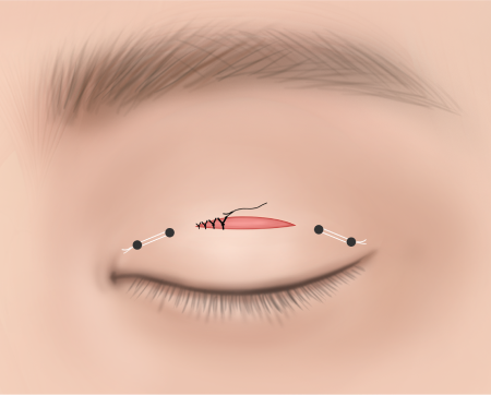 눈꺼풀 안쪽과 피부표면을 실로 연결합니다.